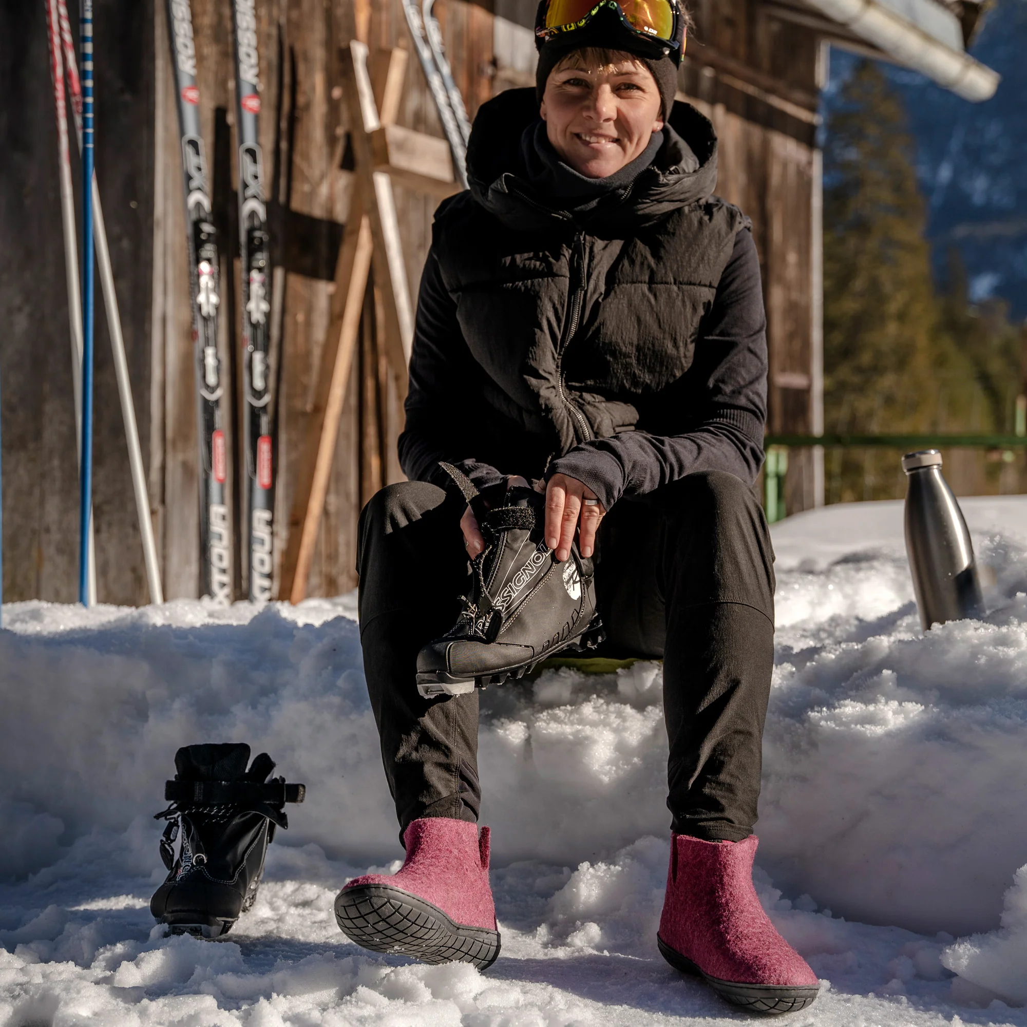 Our boots are made of 100% pure, natural wool in the colour cranberry with a sole of natural rubber in the colour black.
